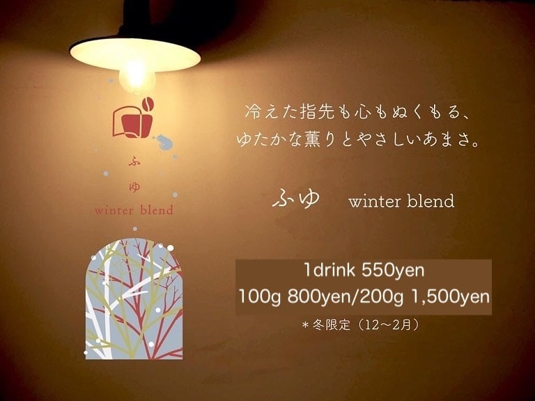 深煎り。 冬の寒い日に、ストーブが焚かれた暖かい部屋で本を読みながら。 そんなイメージで「ふゆ」は完成しました。 マンデリンのふくよかさとコクをベースに、グアテマラが調和を、コスタリカが甘い余韻をもたらしてくれます。 期間限定(12〜2月)のブレンドです。 ■内容量:100g ■生産国:インドネシア、グアテマラ、コスタリカ 【配送料について】 ご購入の珈琲豆(粉含む)が ■合計400g(商品の組合せ可)以下の場合 ゆうパケットにて1個口で発送可能(全国一律330円)。 ※ゆうパックをお選びいただくこともできます(送料は配送先地域によって異なる)。 ■合計400gを超過する場合 ゆうパケットにて複数小口、もしくはゆうパックにて1個口、どちらか送料の安い手段を当店で選択し、発送いたします。 ※内容量は200gのパッケージもございます。 ※粉の挽き目について、ご相談承ります。備考欄、もしくはCONTACTよりお知らせください。(エスプレッソ用・極細挽きは対応しておりません) ※ご注文確定後に焙煎し、発送いたしますため、お手元に届くまで1週間程度かかる場合がございます。 ※大口でのご注文、承ります。CONTACTよりお問い合わせください。