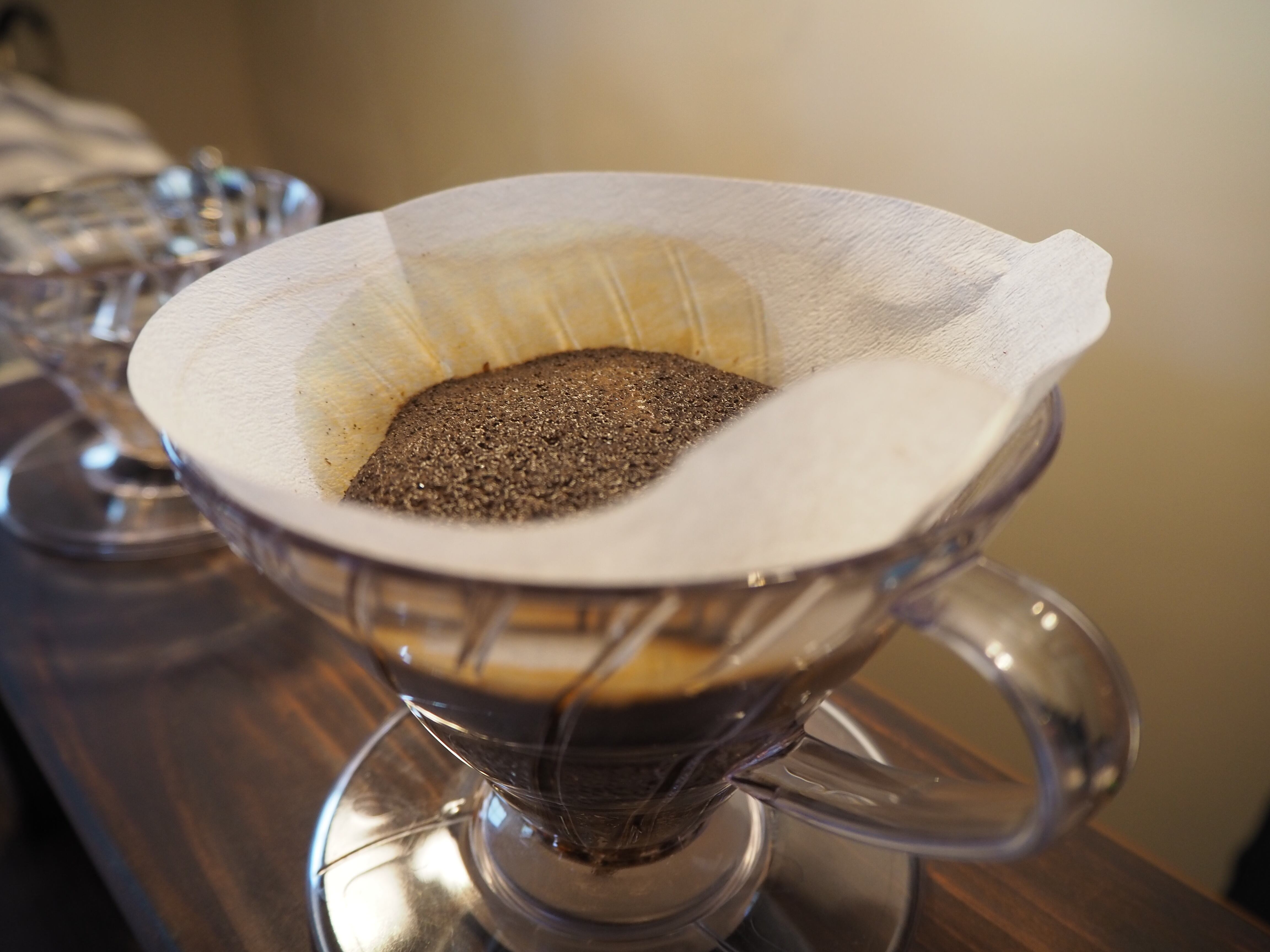 V型円すい形のペーパーフィルターは、珈琲粉の層が深く、